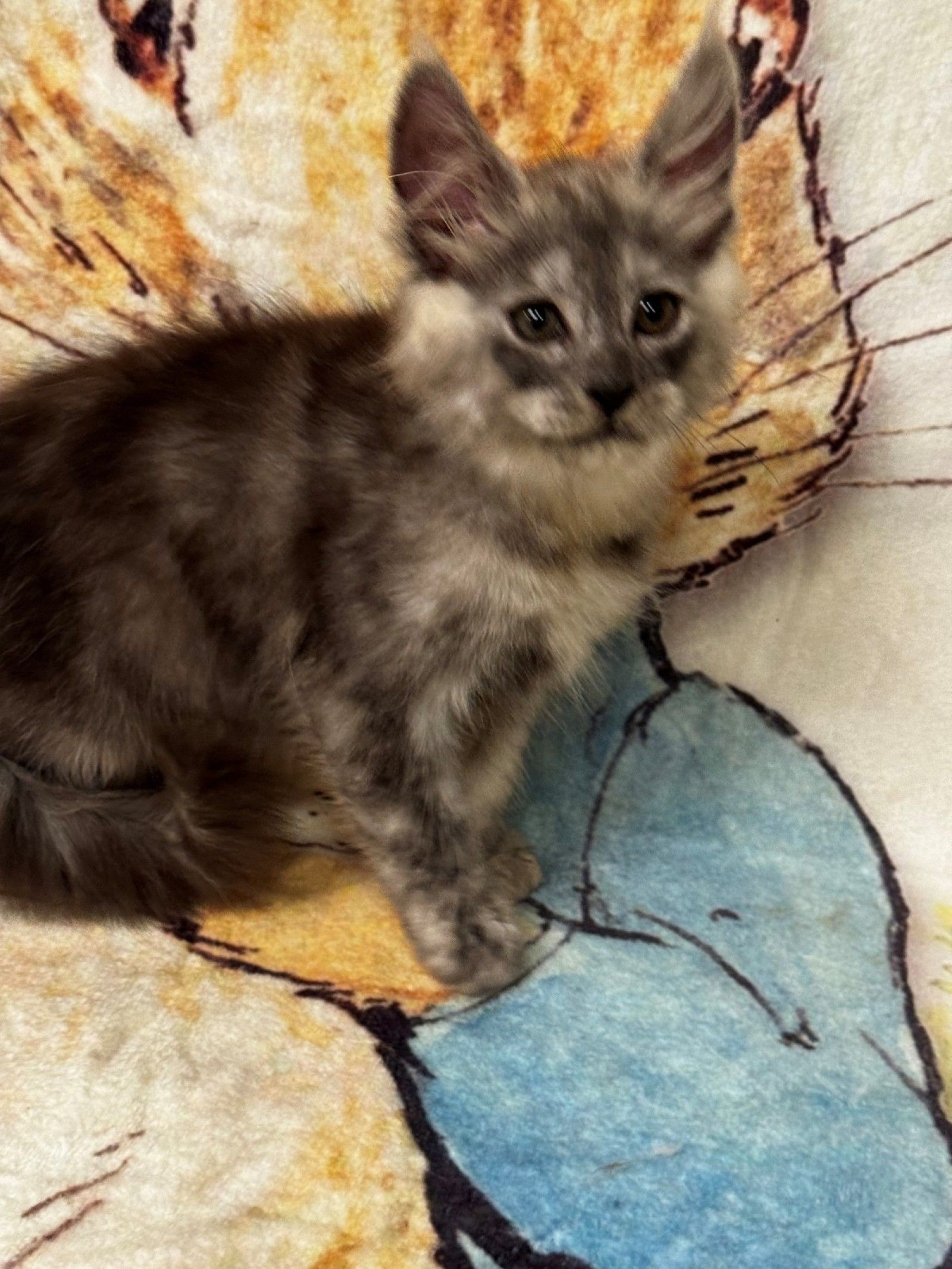 A deep and velvety black smoke boy with striking dark features. His coat already shows beautiful density, and his bright little eyes give him a thoughtful look. A gentle and cuddly kitten who will grow into a handsome, bold young Maine Coon.