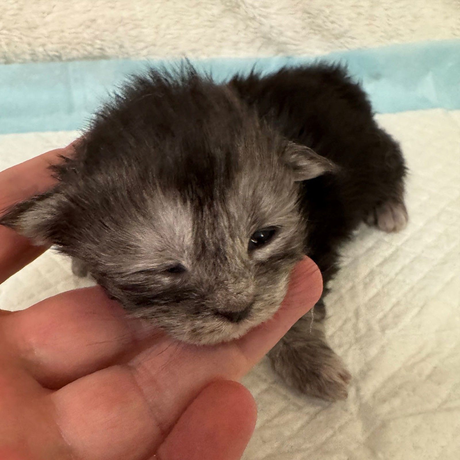 This gorgeous little girl has deep smoke colouring with bright silver highlights around her face and paws. She’s already showing that classic Maine Coon confidence and spark.