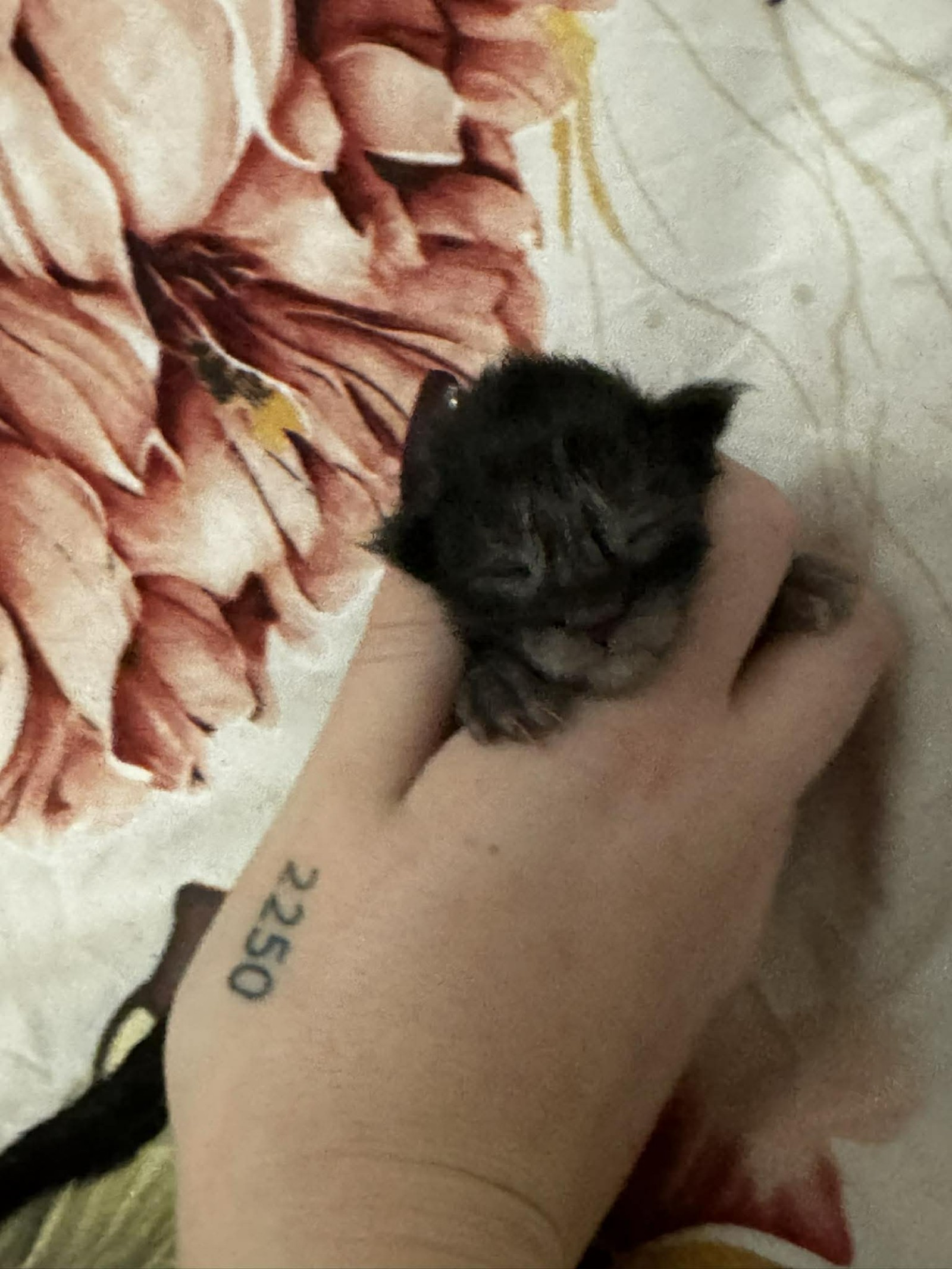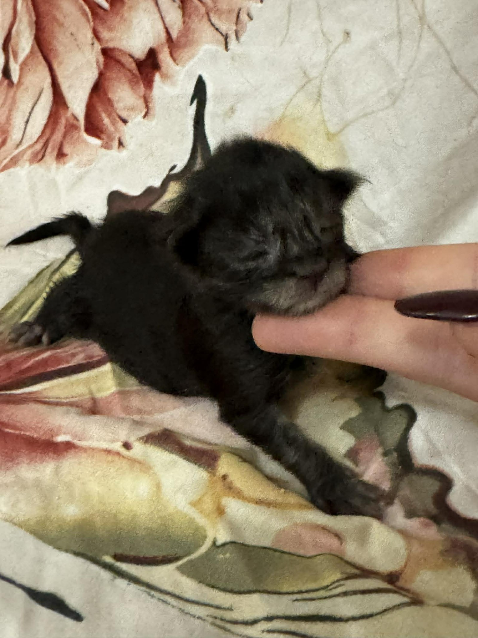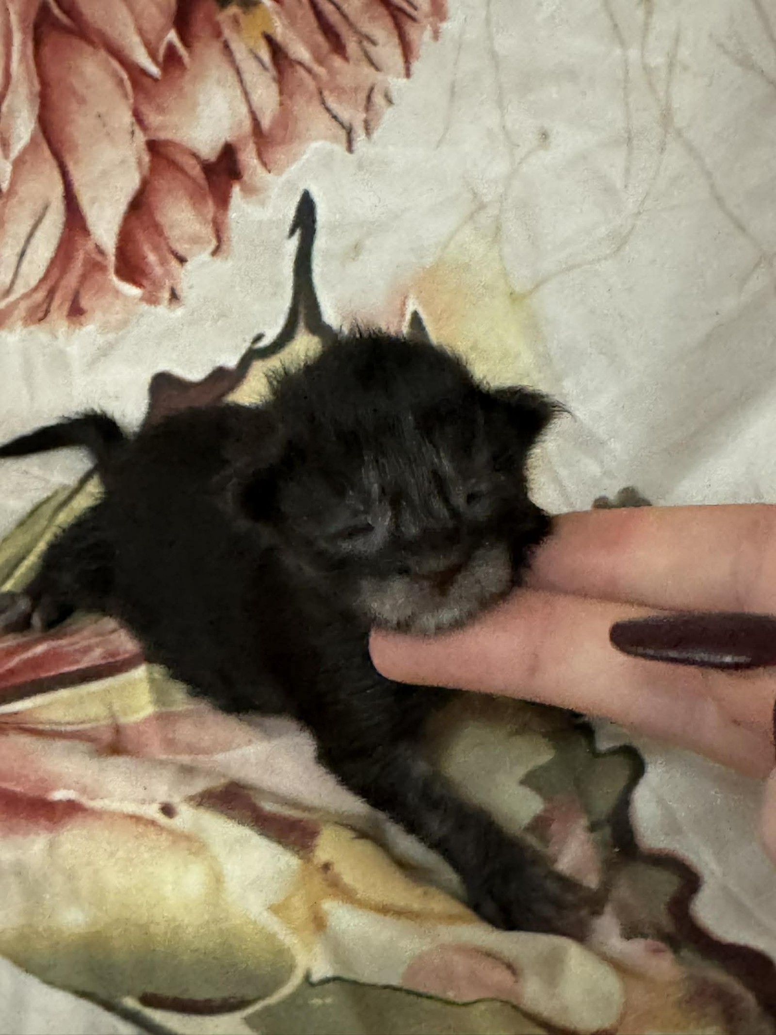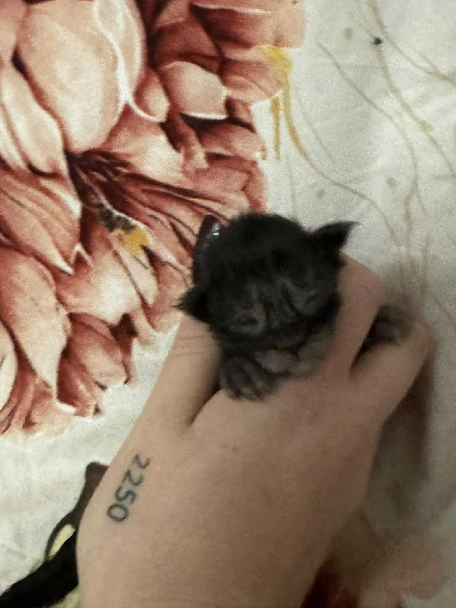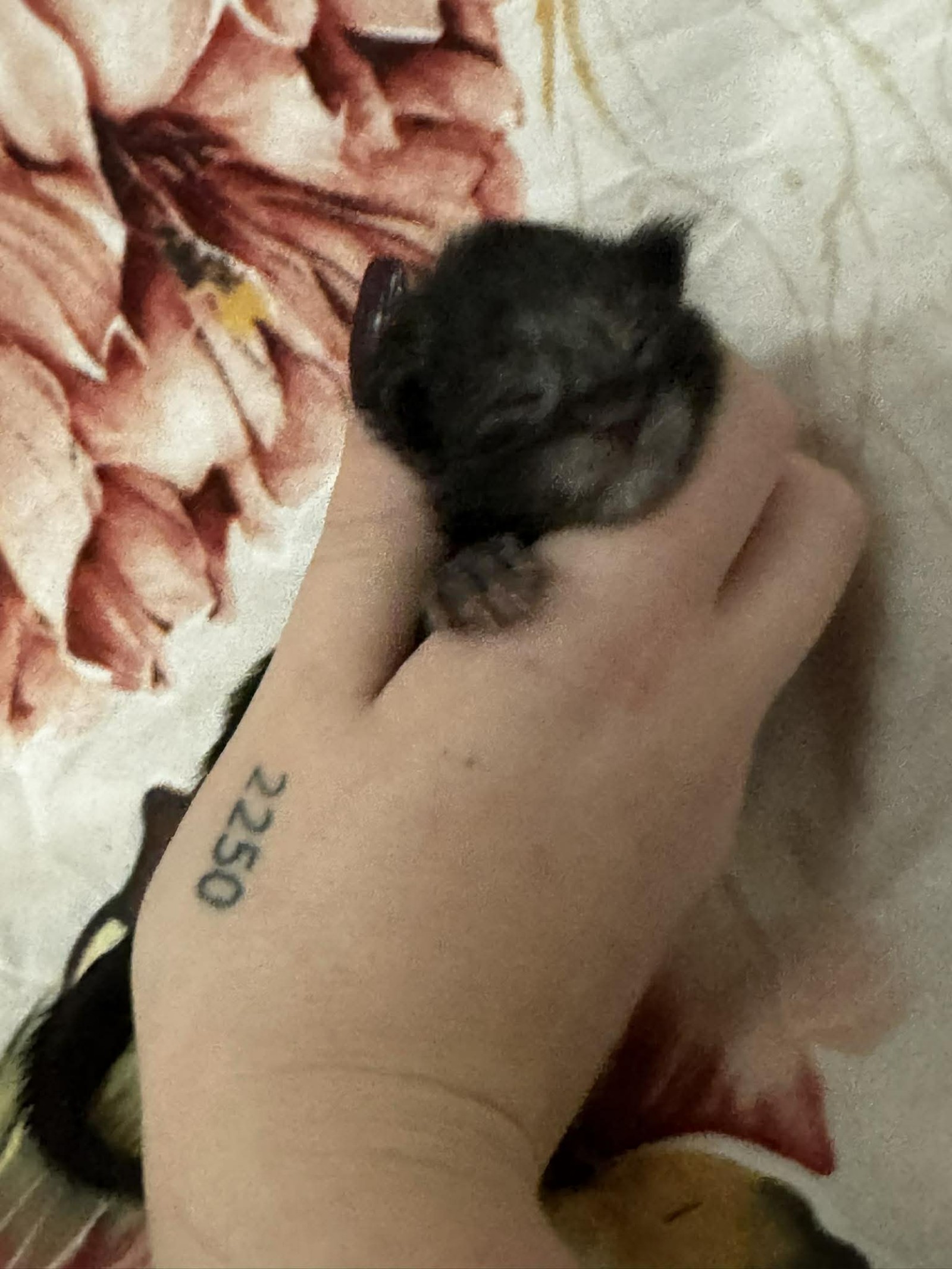 He appears calm and content, enjoying the reassurance of gentle handling and the comfort of a warm, secure environment. Even at this early stage, his soft coat and lovely little expression hint at the handsome features that will continue to develop as he grows.