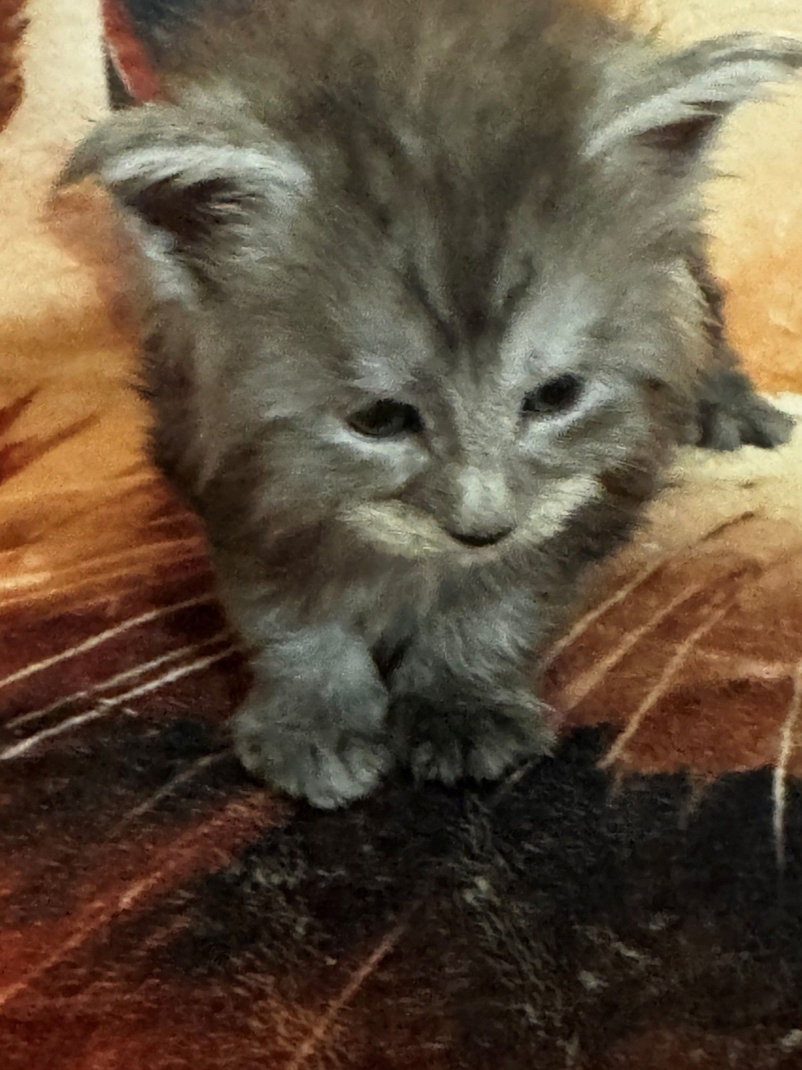 A sweet little girl with soft smoke shading beginning to emerge through her coat. She has a gentle expression and a calm, settled nature when handled. Her colouring is expected to deepen as she grows, revealing dramatic contrast and classic Maine Coon elegance.