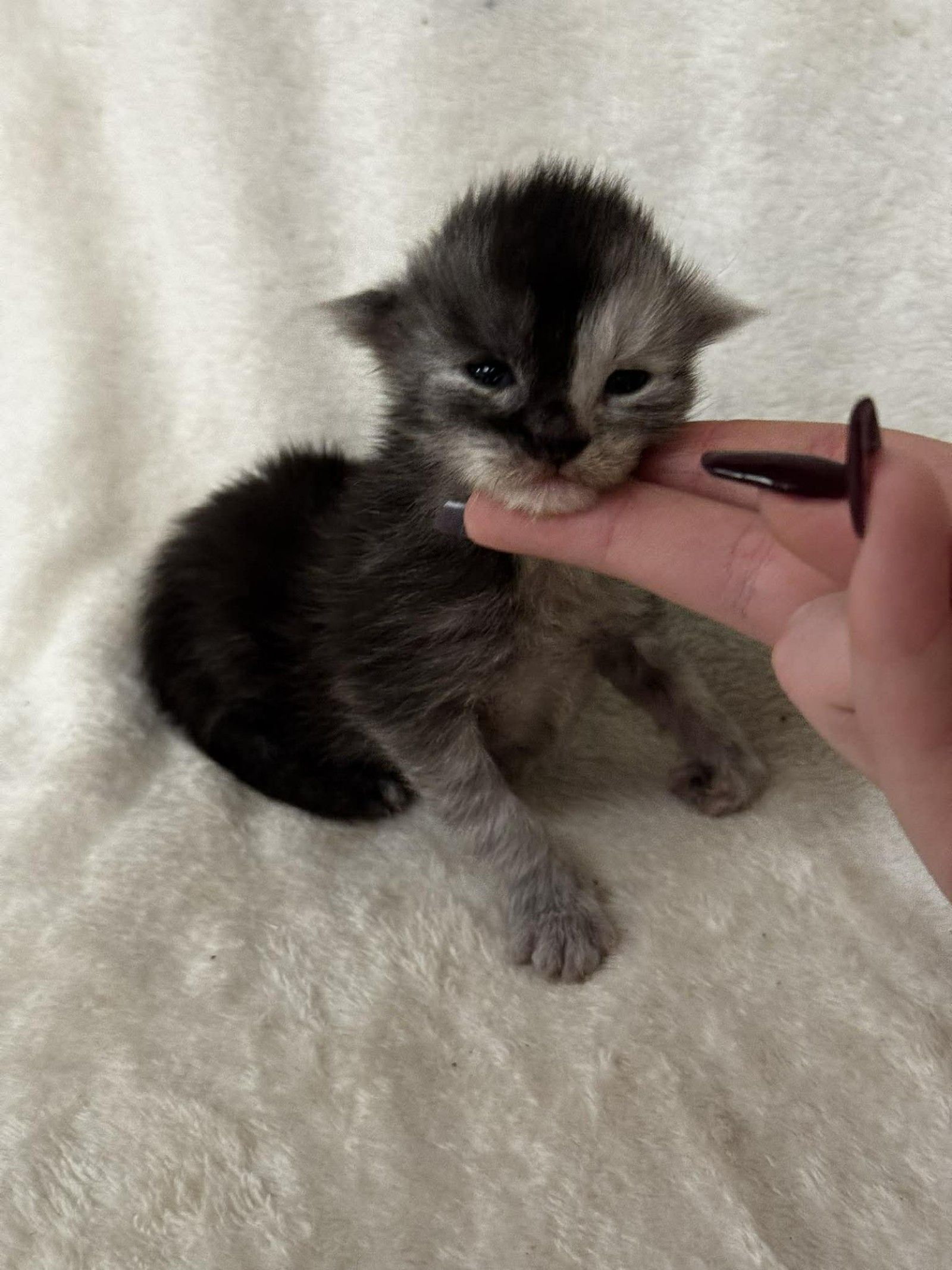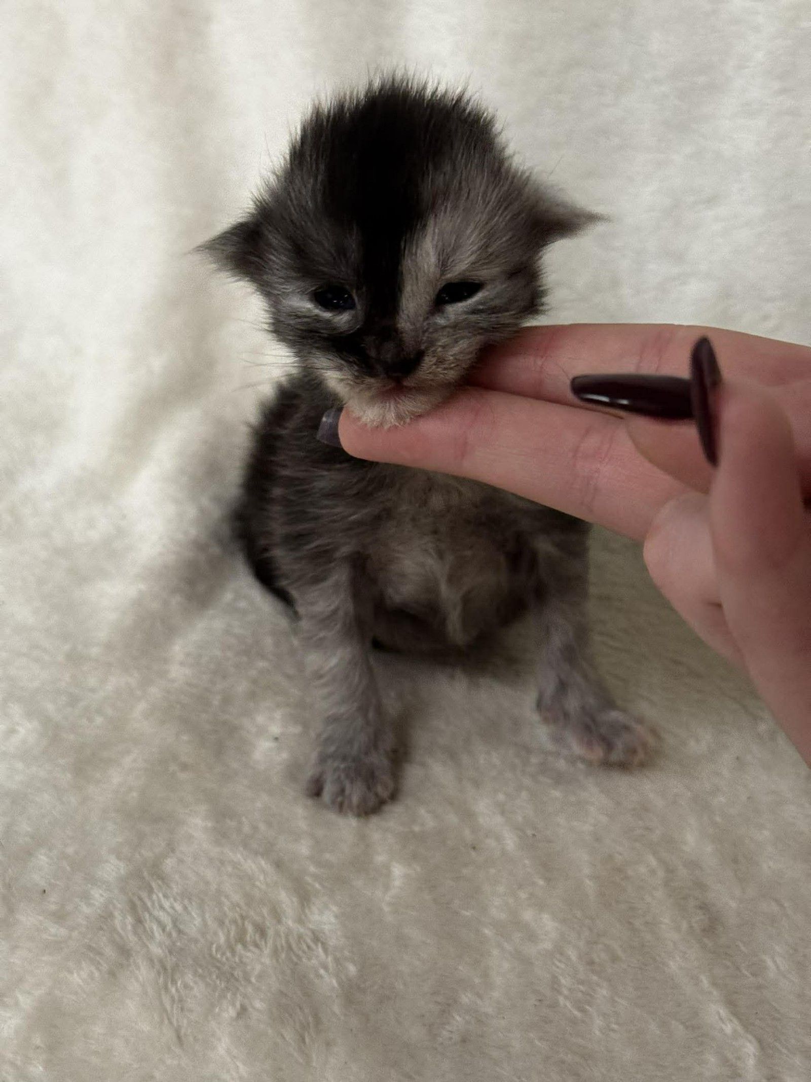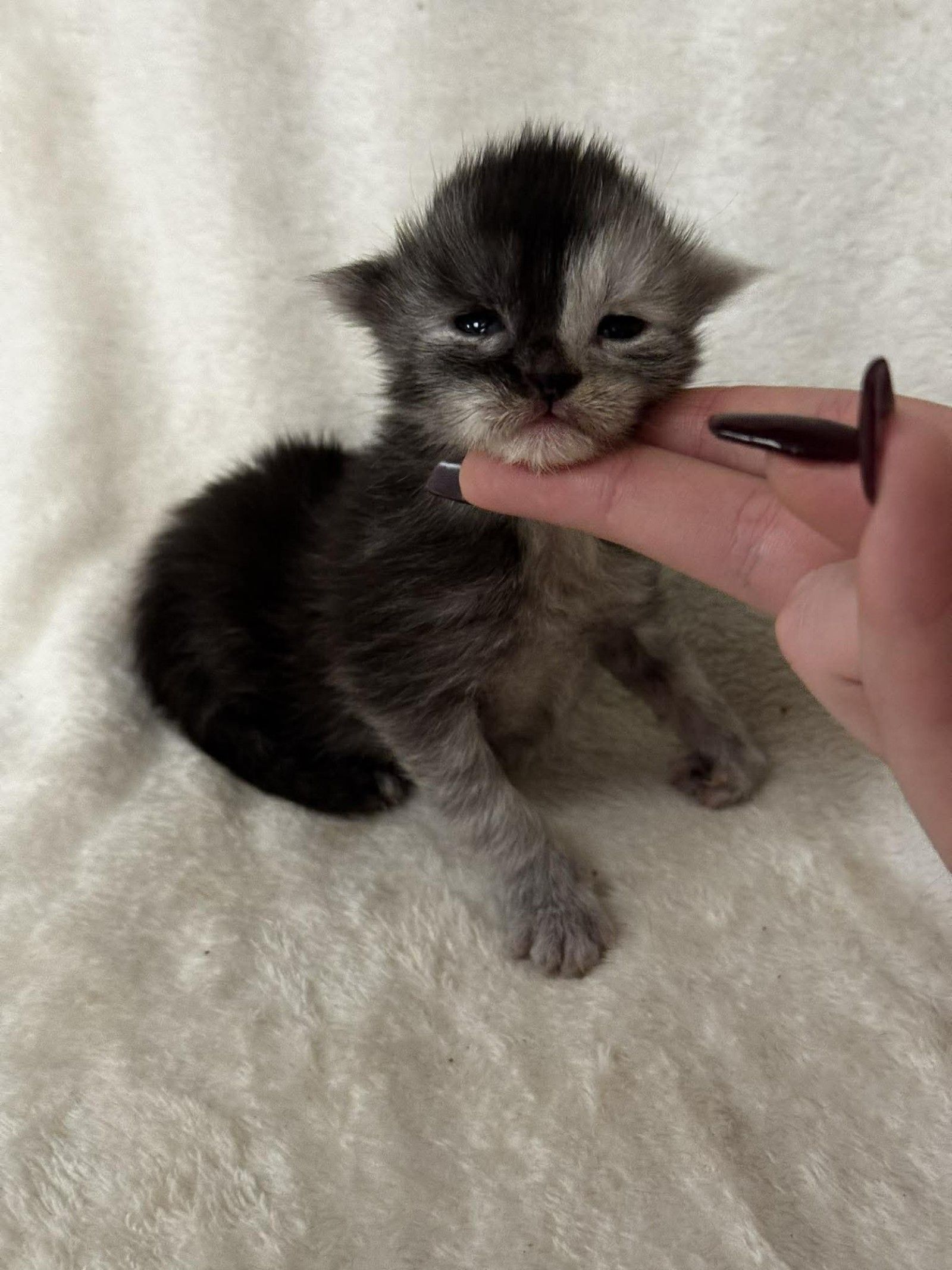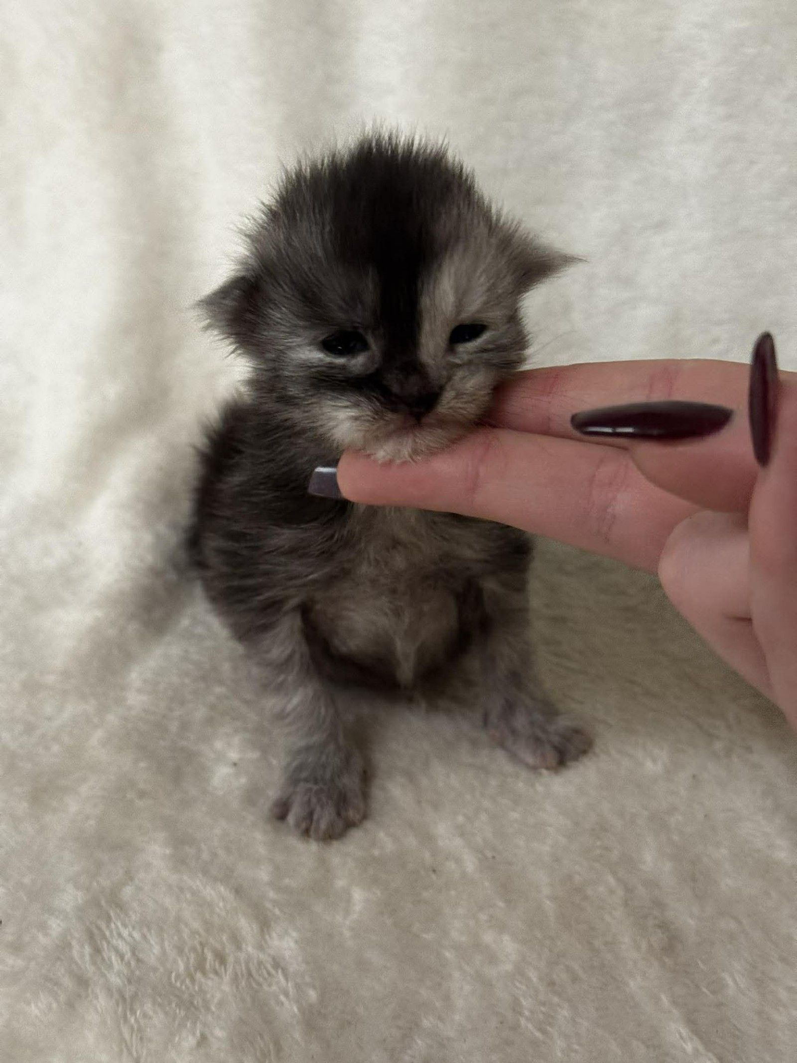 She has a sweet, settled nature and looks content being gently handled, enjoying warmth, comfort, and quiet attention. Her soft coat and expressive features hint at the striking Maine Coon she will grow into as she matures.