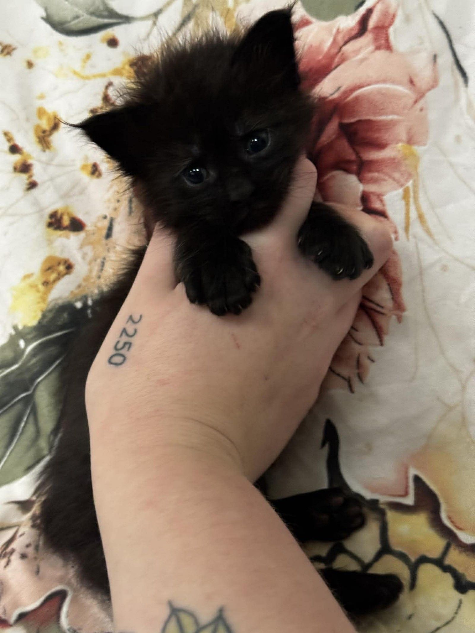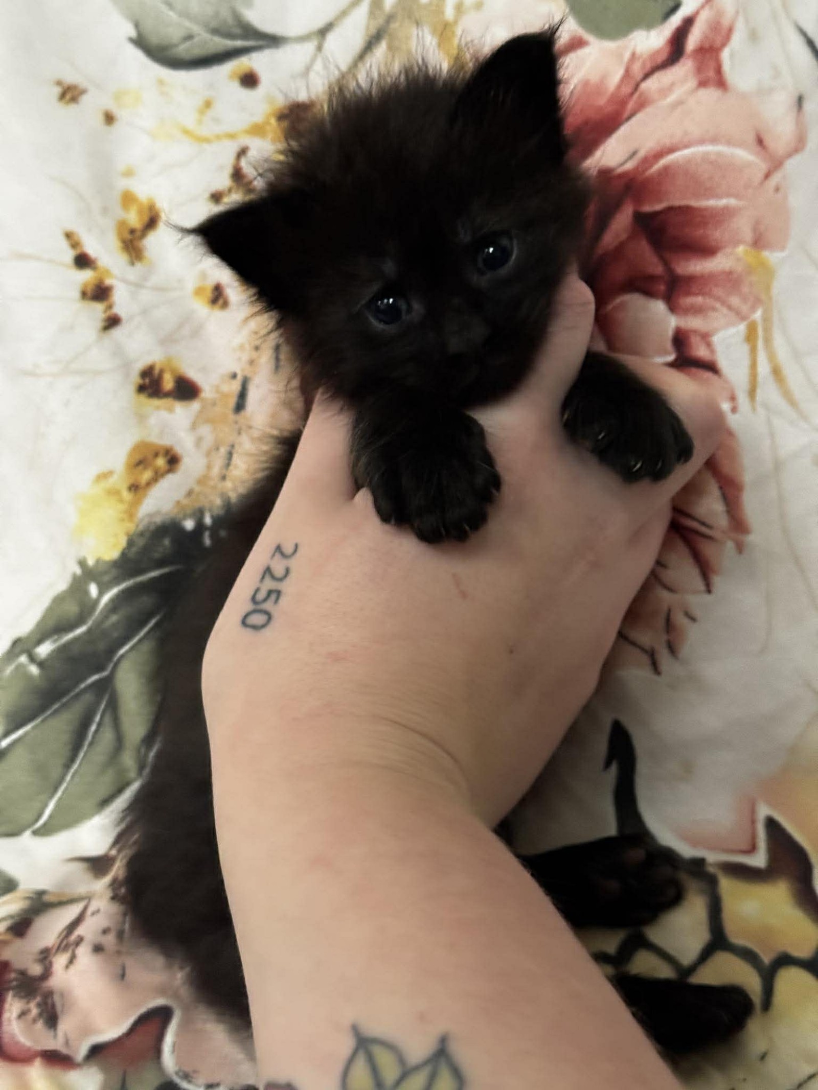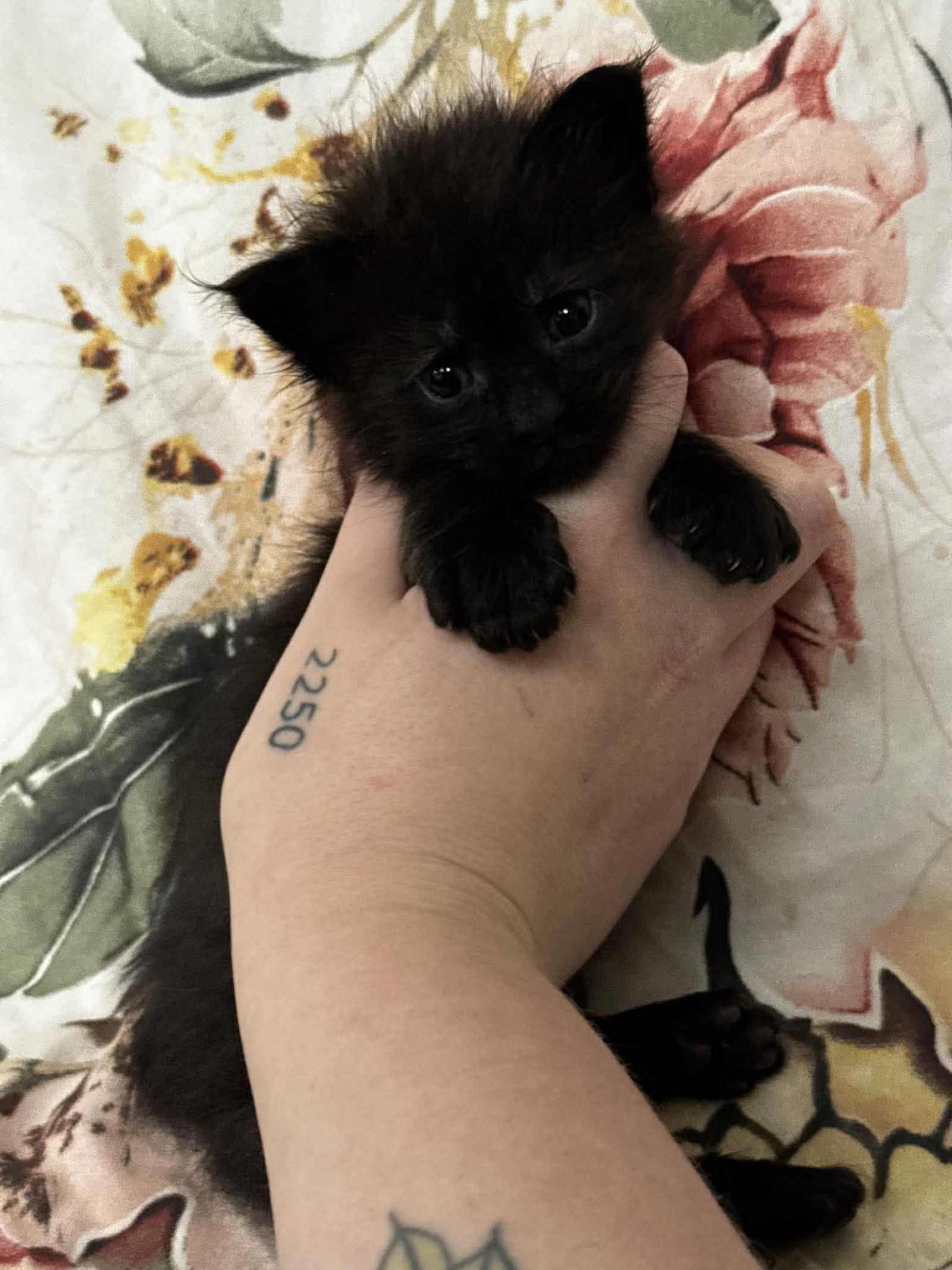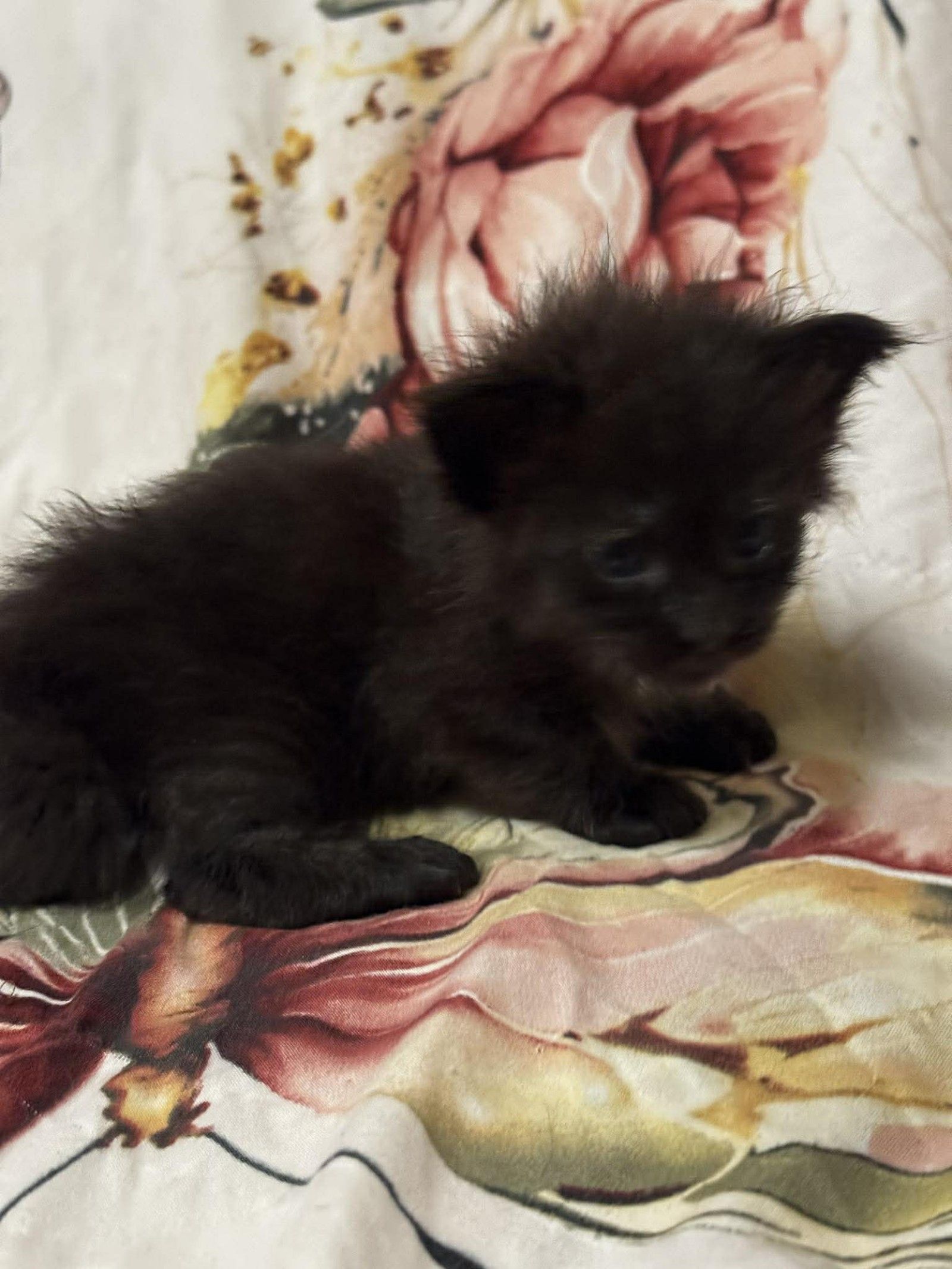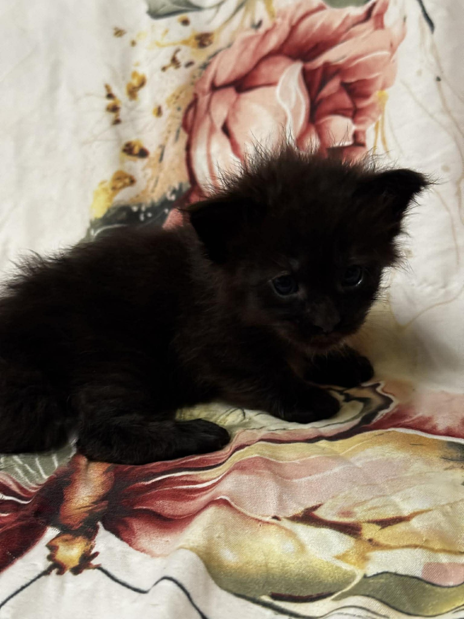 This beautiful Black Solid girl has a rich, velvety coat and a sweet little face full of curiosity. Even at this tiny age, she already has a lovely presence, with bright eyes and soft features that give her a gentle and endearing look.