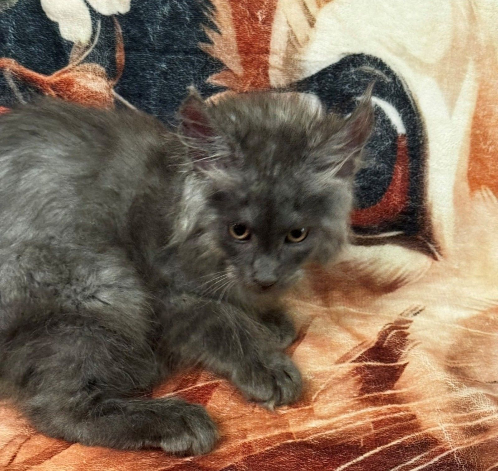 This lovely Blue Smoke girl has a soft blue-grey coat with subtle smoke shading that gives her a gentle, misty appearance. Her calm expression and relaxed posture suggest a sweet, easygoing nature, while her plush coat and developing ear set point to classic Maine Coon type. As she matures, her smoke contrast is expected to become more pronounced, revealing a beautiful balance of depth and softness in her colouring.