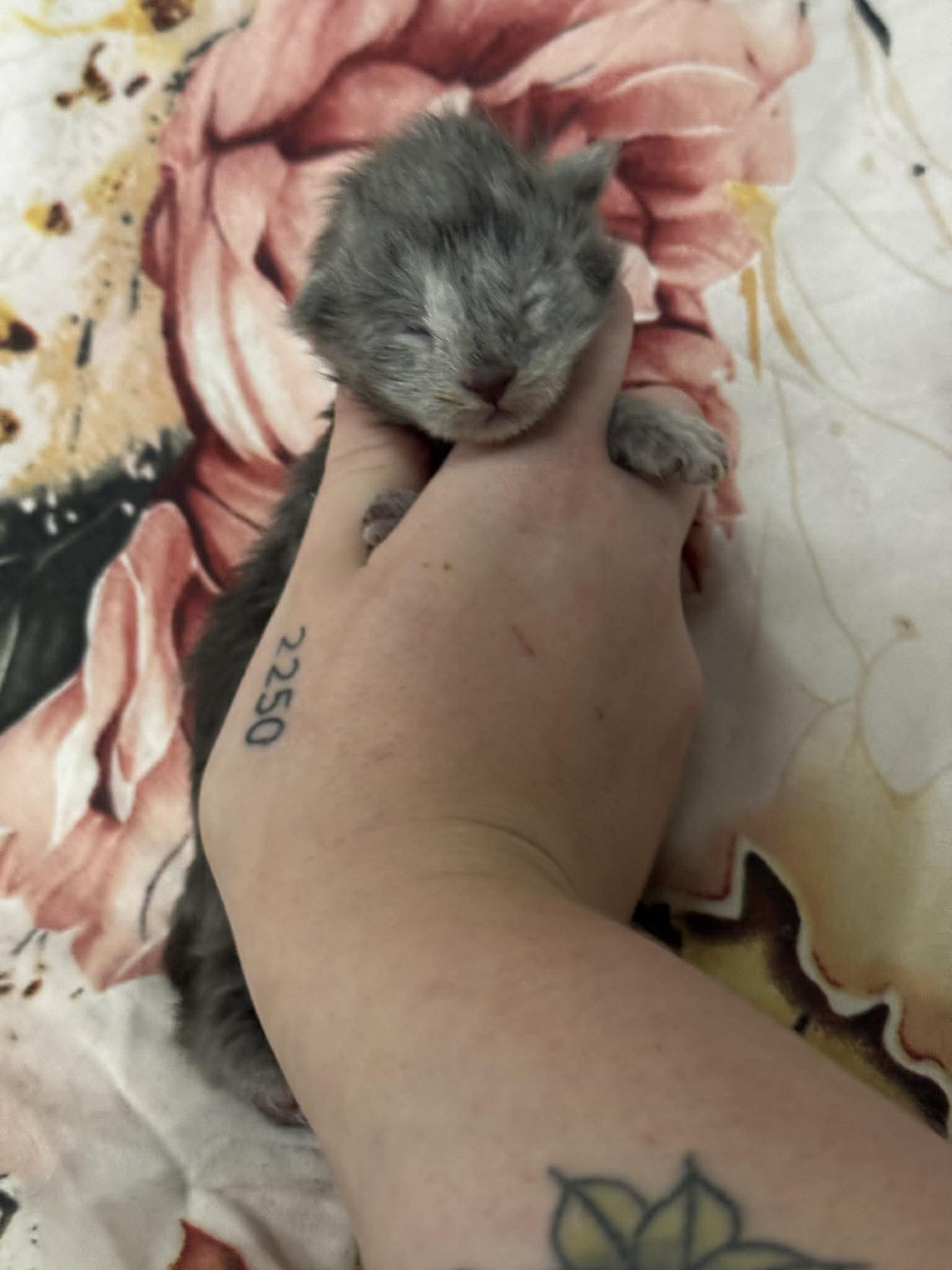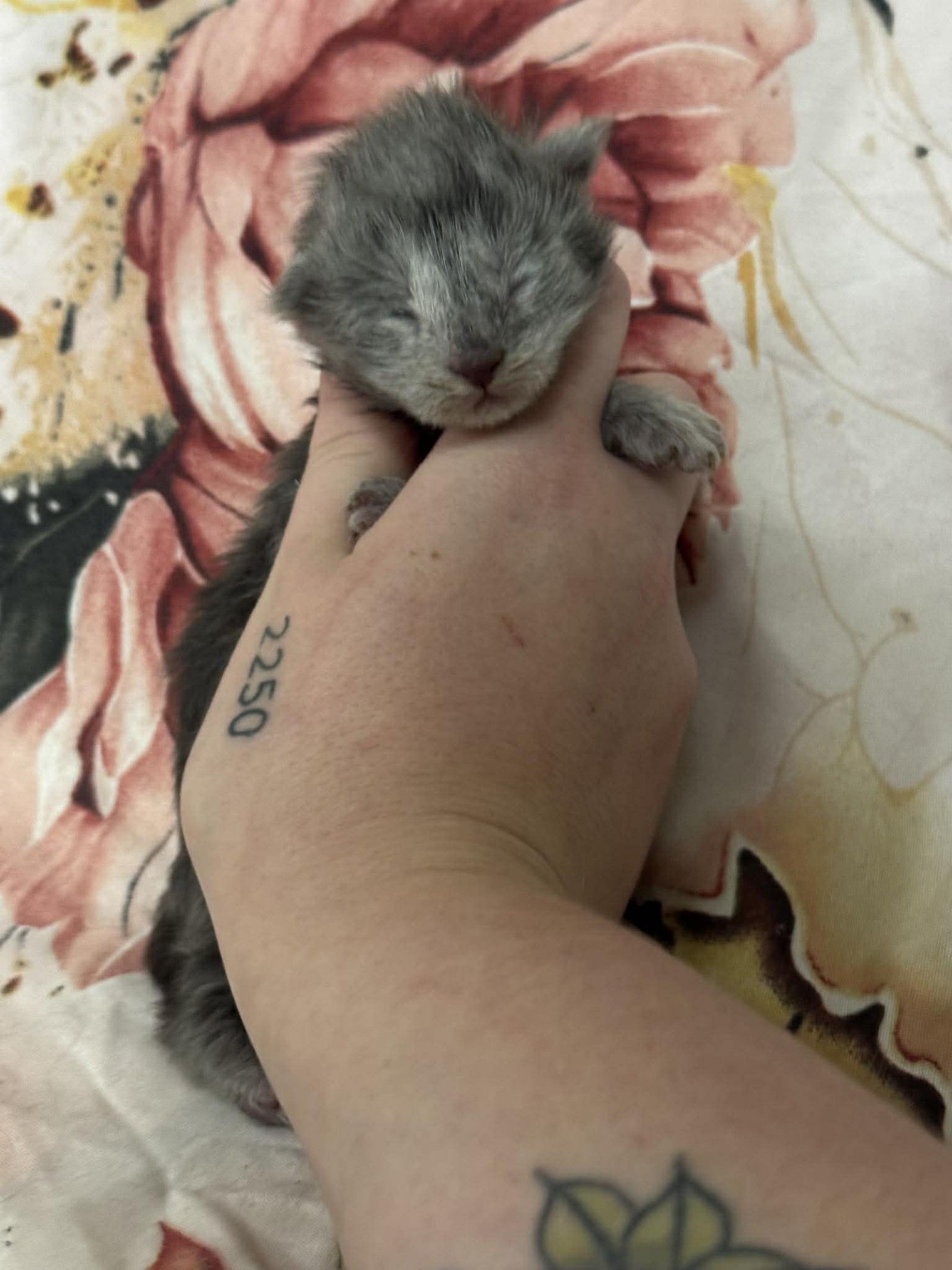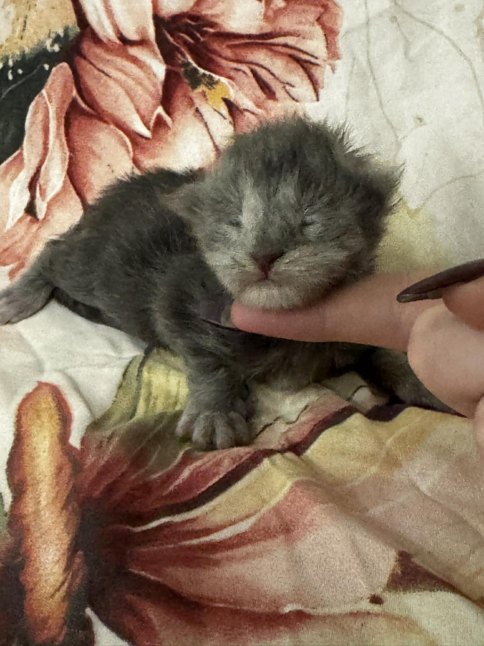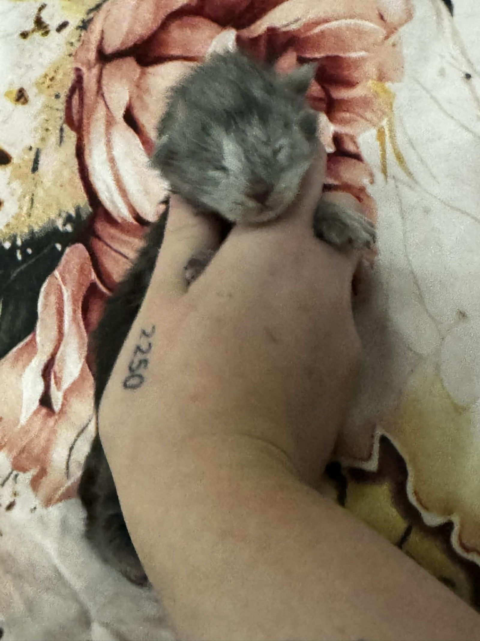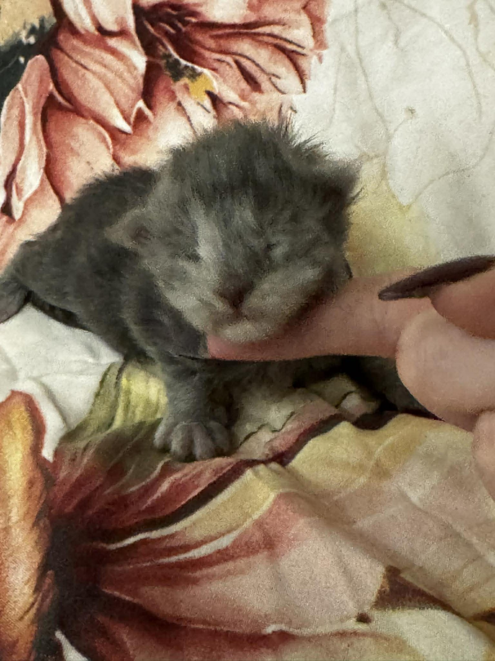 This handsome Blue Smoke boy has a plush little coat and a soft, misty colouring that already makes him stand out. His tiny face and peaceful expression give him a gentle charm, while his fluffy coat hints at the beautiful Maine Coon he will become.