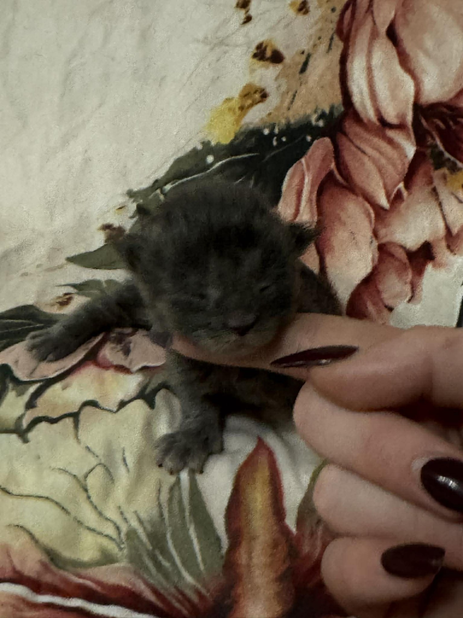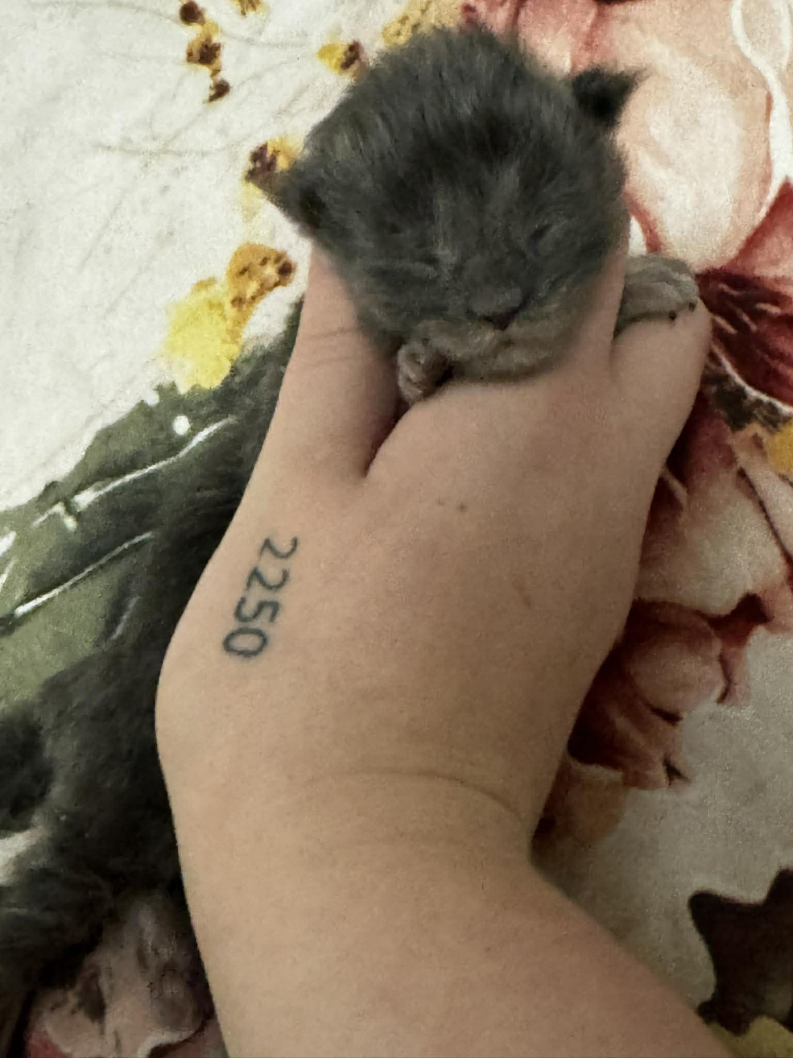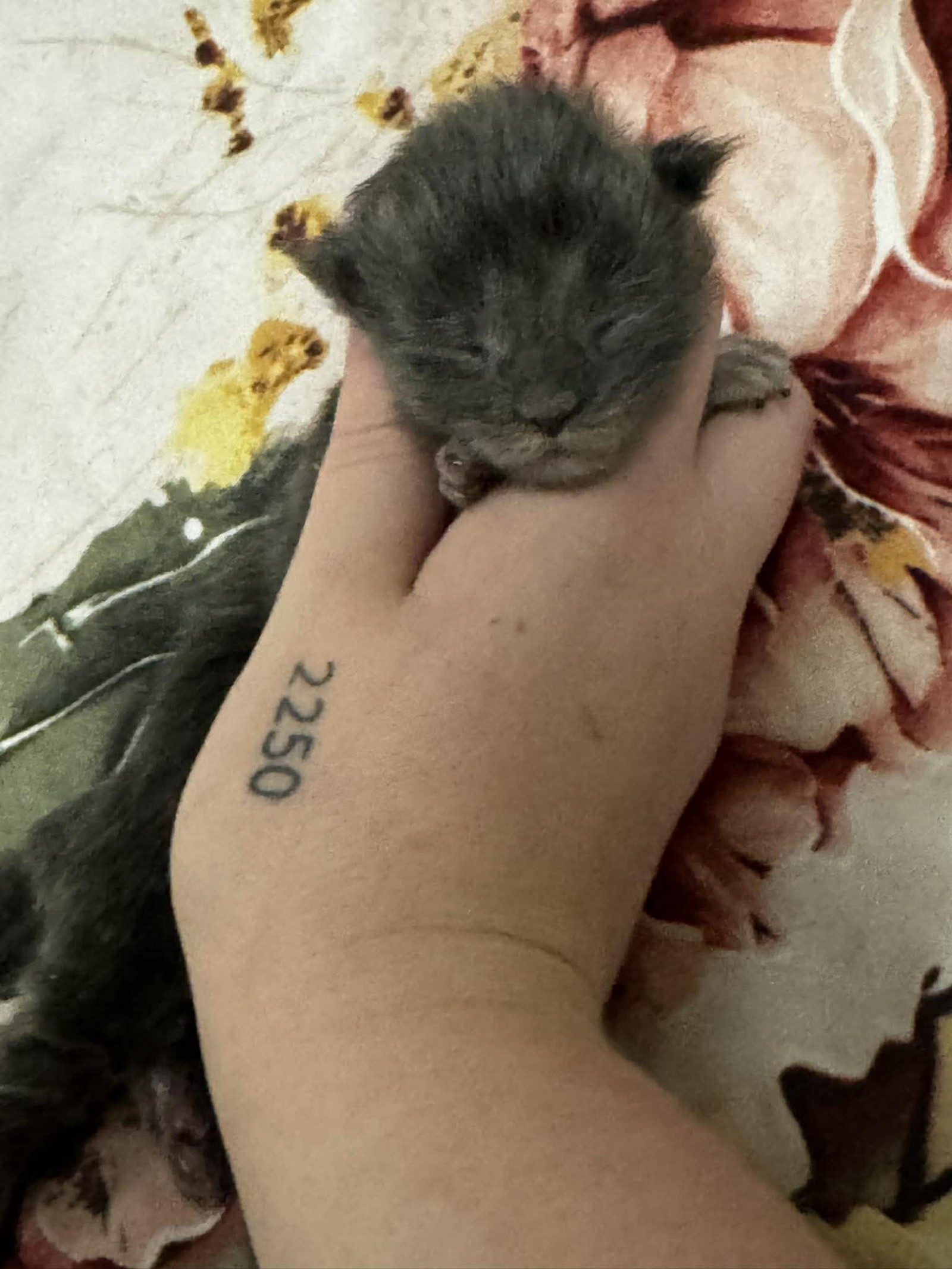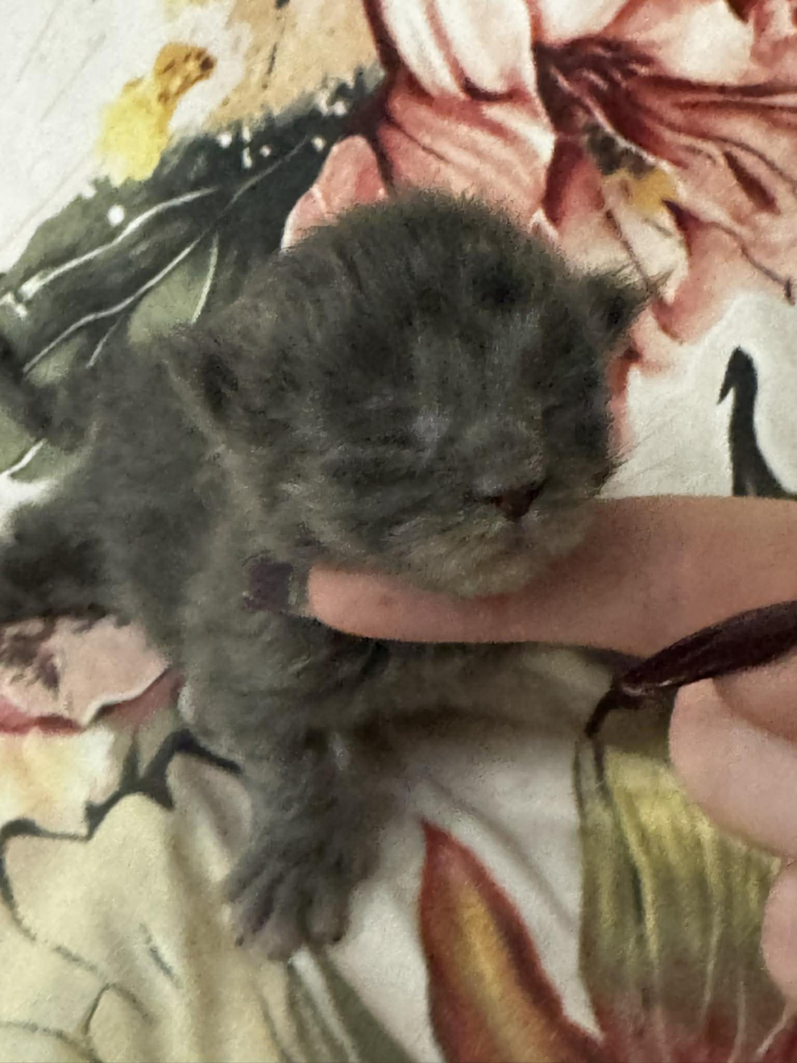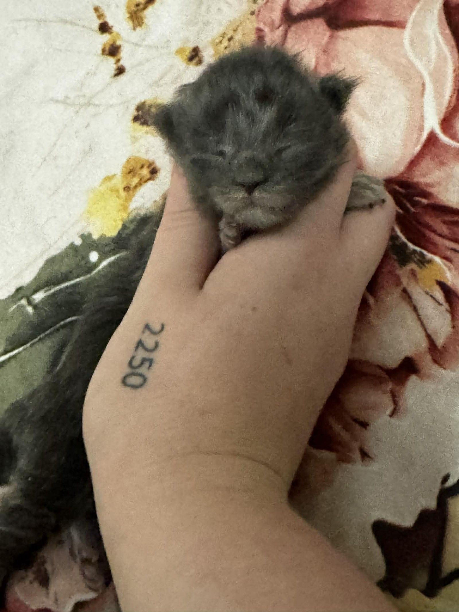 She appears settled and comfortable, enjoying the warmth and security of being handled. As she matures, her smoke colouring will continue to unfold, bringing out the beautiful layering and contrast in her coat.