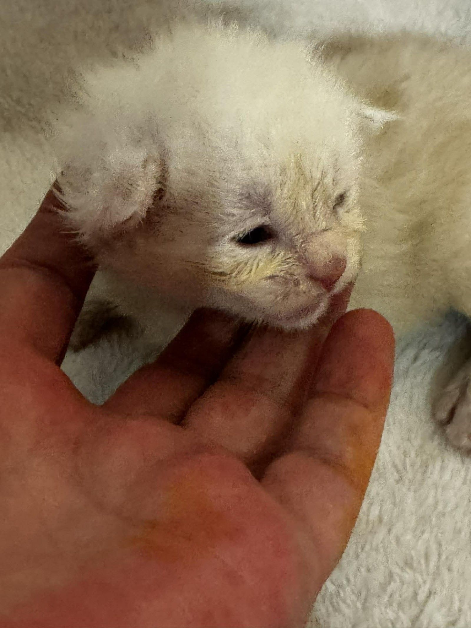 He appears calm and settled, enjoying the comfort of gentle handling and the security of a warm environment. His soft coat and delicate little expression hint at the handsome Maine Coon he will grow into as he matures.