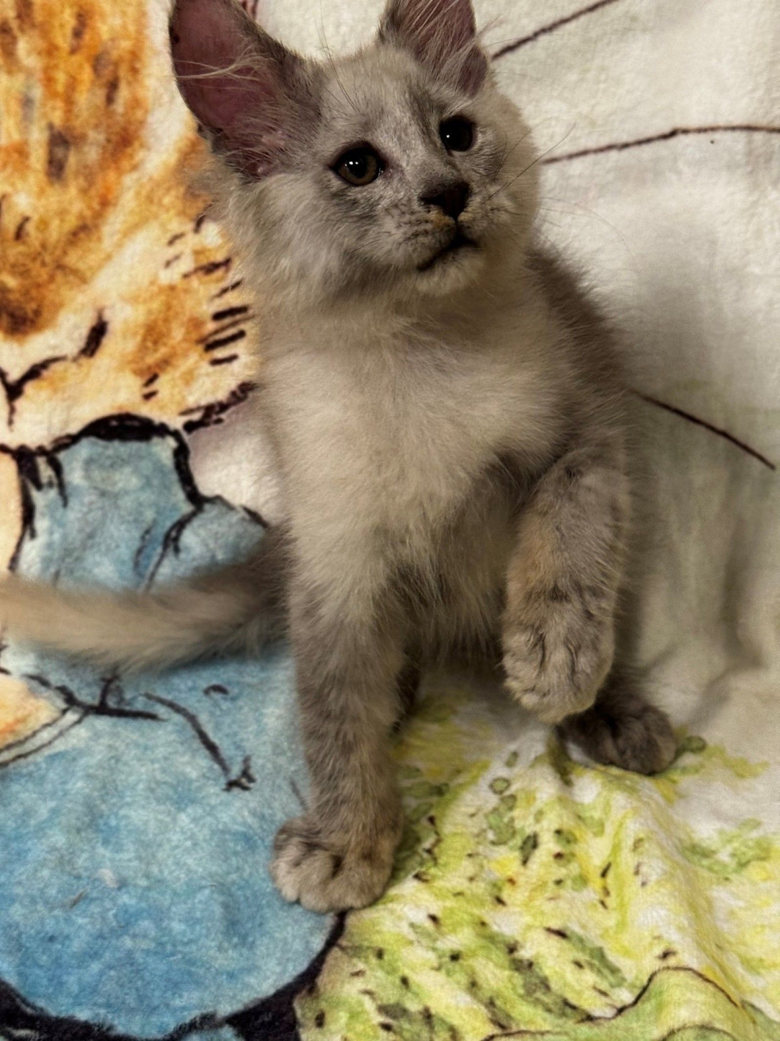 This lovely kitten has a classic light smoke coat with silver tones spreading beautifully across his face and body. Curious but polite, he has a balanced temperament and enjoys exploring at his own pace.