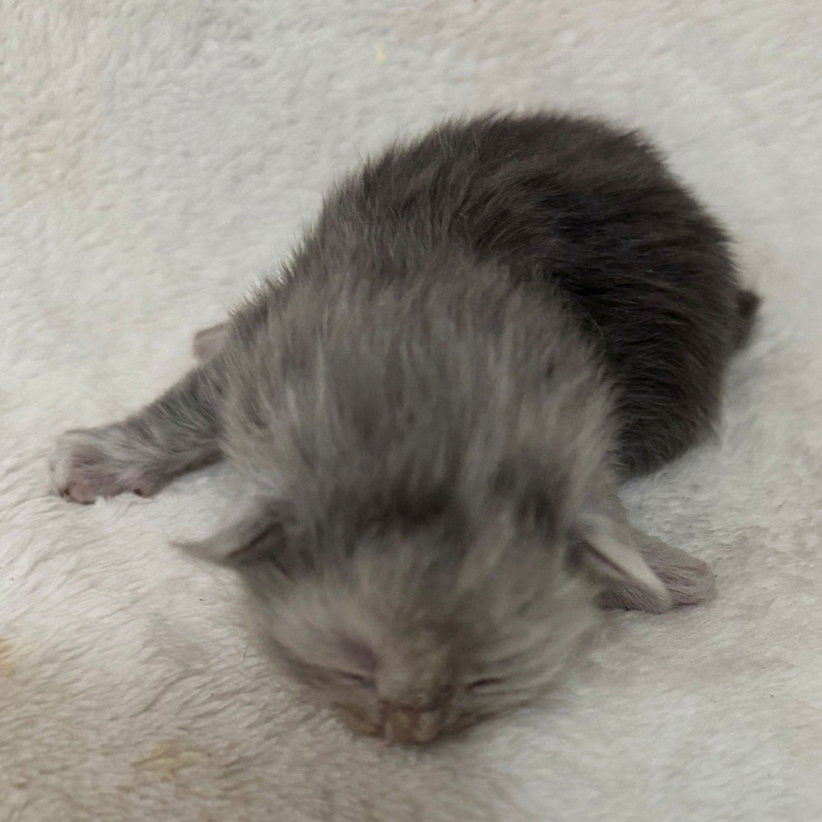 A confident kitten with a velvety silver coat that glistens in the light. This boy will grow into a regal young Maine Coon, full of character and charm.