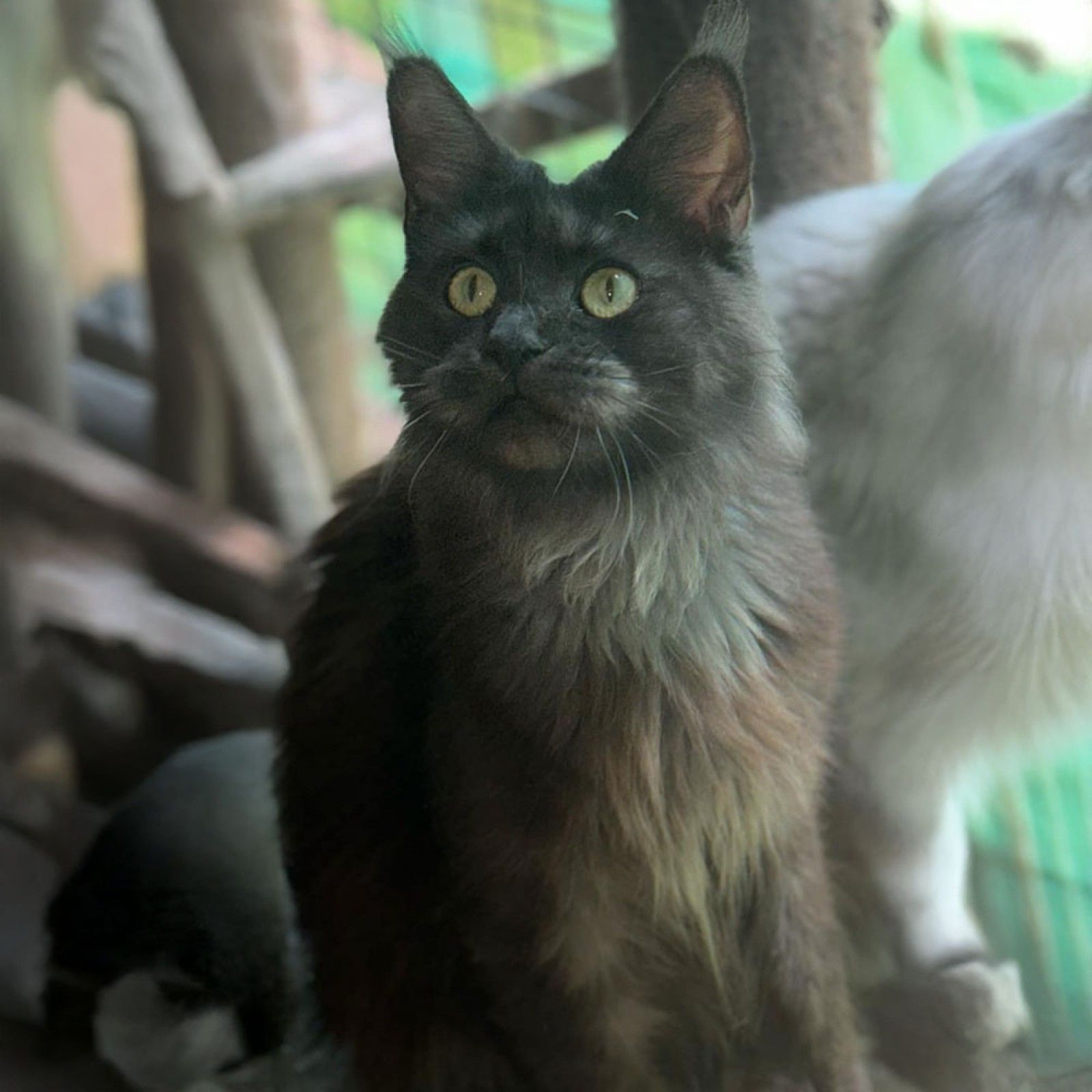 Brittany is bold and affectionate, with extra toes and an intense smoky coat. Her playful spirit makes her a favourite among visitors and family alike.
